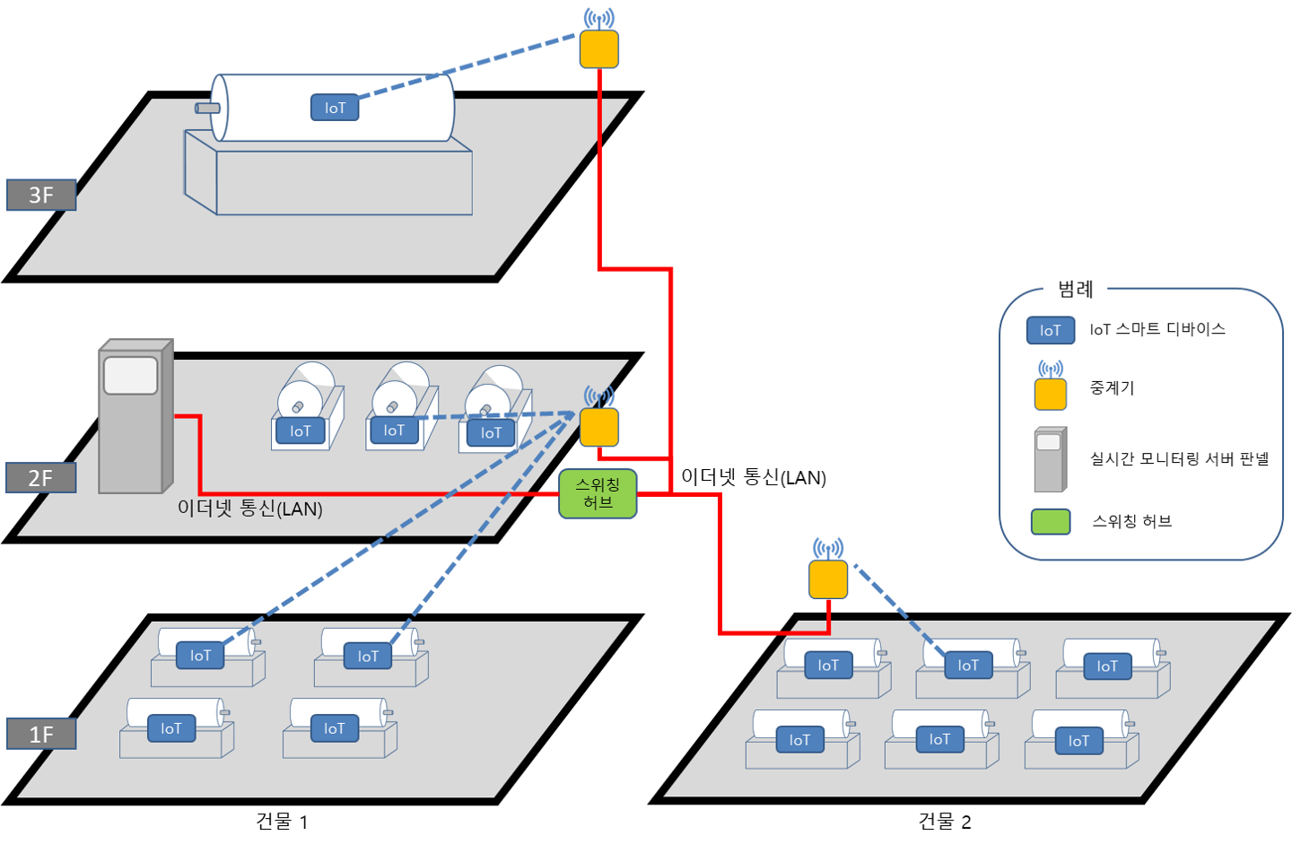 여러 건물과 각 층에 위치한 개별 회전기기에 IoT 센서를 설치하고, 중계기를 통해 데이터 수집, 운전실에서 실시간 모니터링 조회