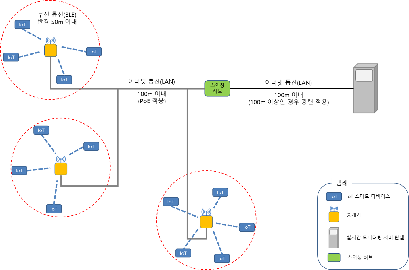 BLE 무선 통신 반경 50m 이내 중계기 설치, 스위칭 허브를 통하여 중계기와 모니터링 서버 연결